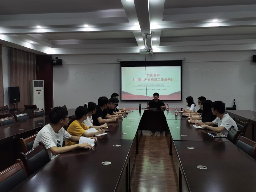 本科生第一党支部在雁山校区萃华楼12407会议室开展学习《中国共产党普通高等学校基层组织工作条例》(以下简称《条例》)主题党日活动,全体党员同志参加活动,本次活动由党支部书记潘泓序主持。