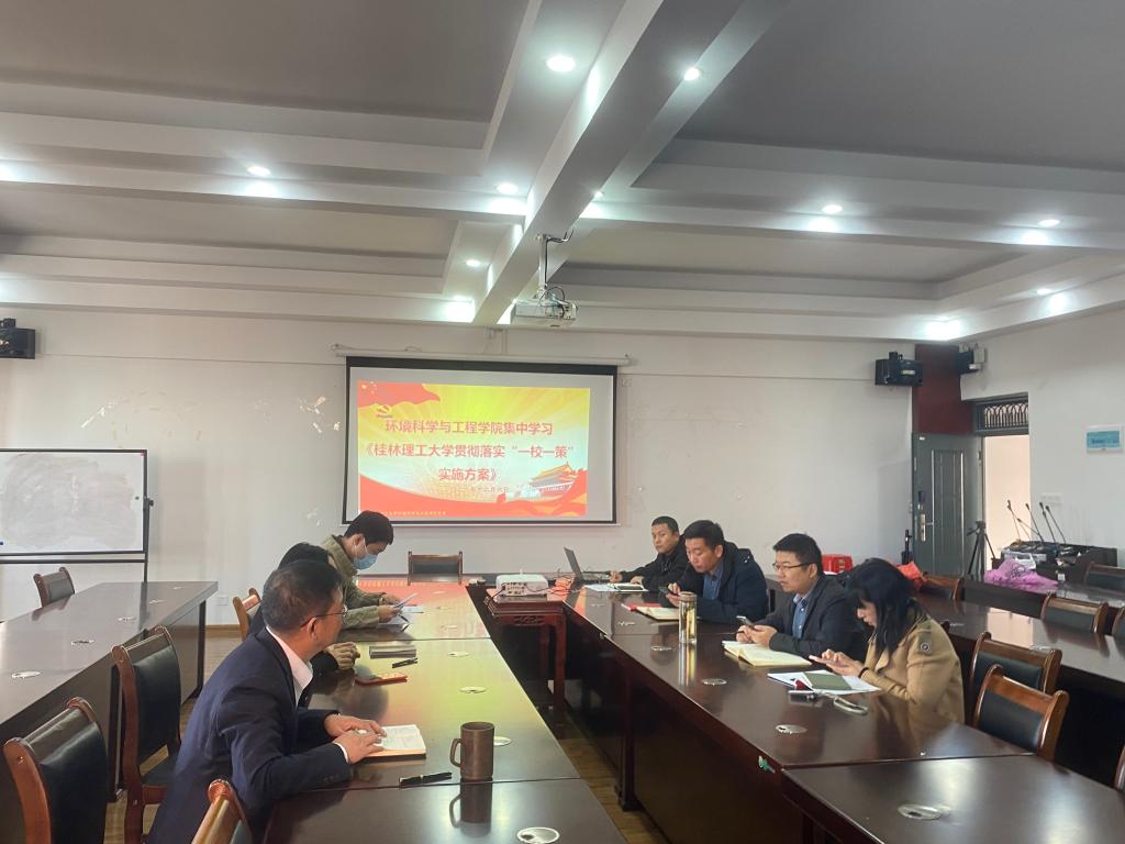 在12407会议室召开学习《桂林理工大学贯彻落实“一校一策”实施方案》专题会议,学院全体党政领导参加会议,会议由学院党委副书记、纪委书记郝文佳主持。