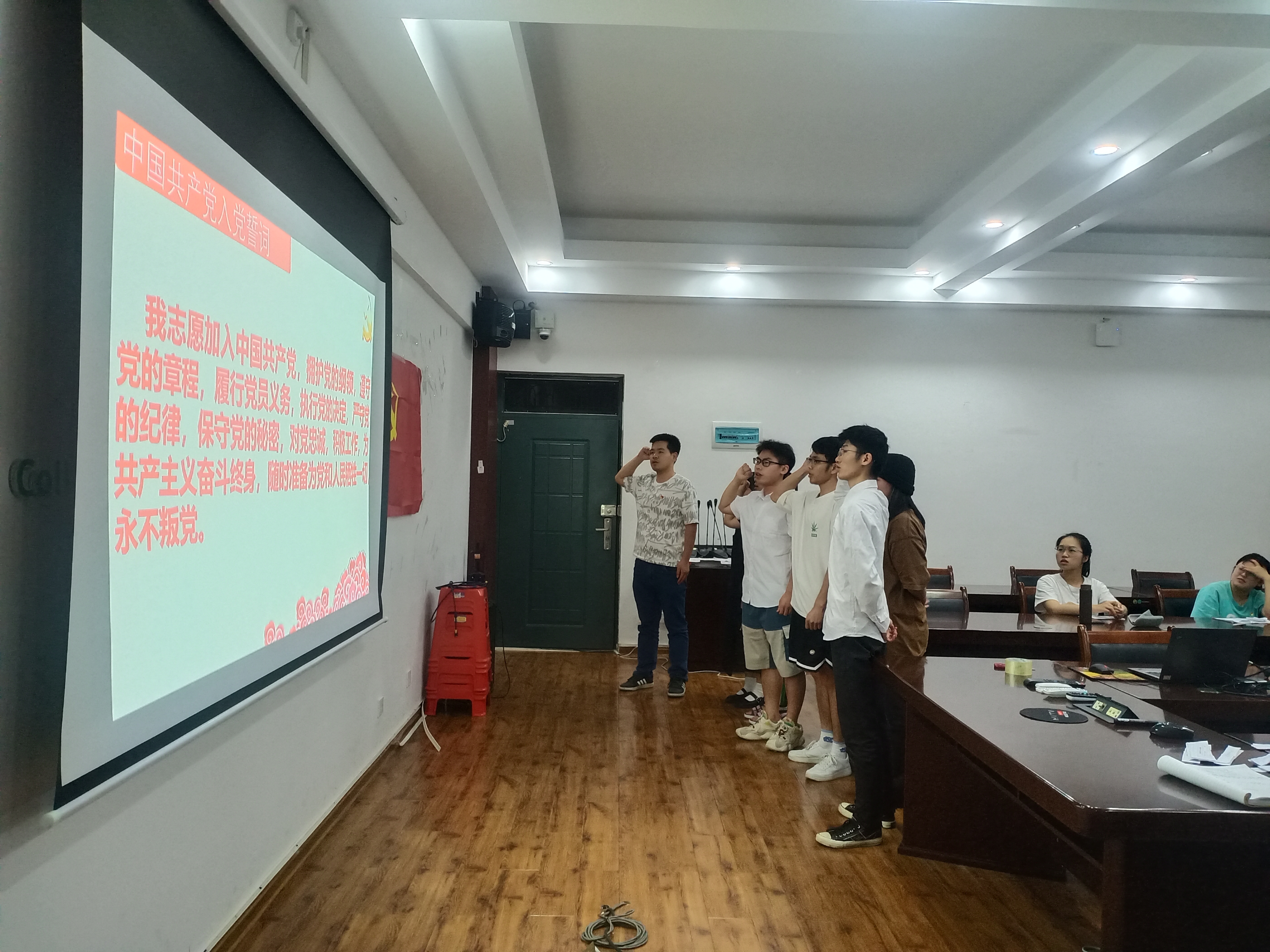 最后,支部书记孙老师带领新接收的预备党员面向党旗庄严宣誓,并带领支部全体党员同志面向党旗重温入党誓词,感悟共产党的艰辛历史,更要记得不忘初心、牢记使命。党员同志要在日常学习、工作、生活中发挥先锋模范作用,预备党员同志也要以党员标准严格要求自己,完善自身不足,改正缺点,向优秀的党员同志学习,在展示党支部风采的同时也对外宣传榜样的力量。