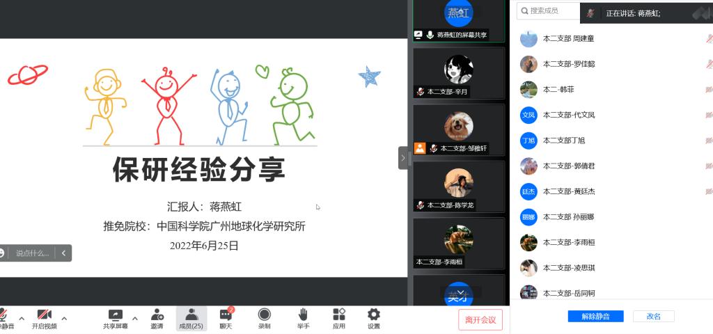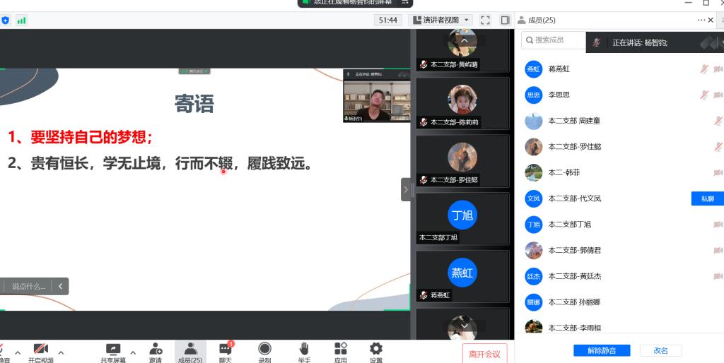 本次党日活动由杨智钧、蒋燕虹同志分别进行考研和保研的经验分享,他们给我们分享了自己考研和保研期间在学习及生活等各方面保持良好状态的经验,并且激励我们奋勇拼搏、自强不息,最终找到适合自己的人生道路。