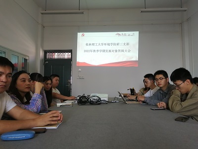 研究生第三党支部于雁山校区萃华楼12412会议室召开了2022年秋季学期入党积极分子转发展对象答辩大会。会议由支部副书记路一鸣同志主持,支部全体党员同志以及积极分子参与本次会议。本次会议的主题是讨论韩宇、耿康慧、胡倩倩、游胜雄、王婷、伍贤辉、毛伟、陈金雄、刘自轩、刘祺、梁亚权、谢妍钿、杨欢、殷万成14名入党积极分子转为发展对象的问题。