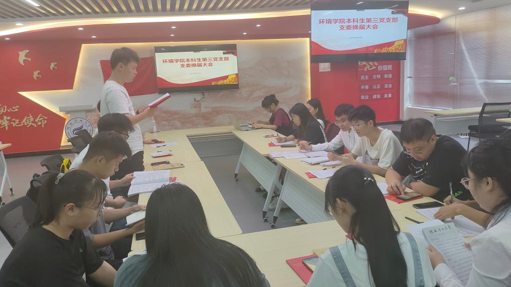 本科生第三党支部于明园思政大讲堂召开了支部委员换届选举会议。支部全体党员同志参与此次会议,本次会议由支部副书记李茜茜主持,支部书记孙云龙老师及支部全体党员参加本次会议。
