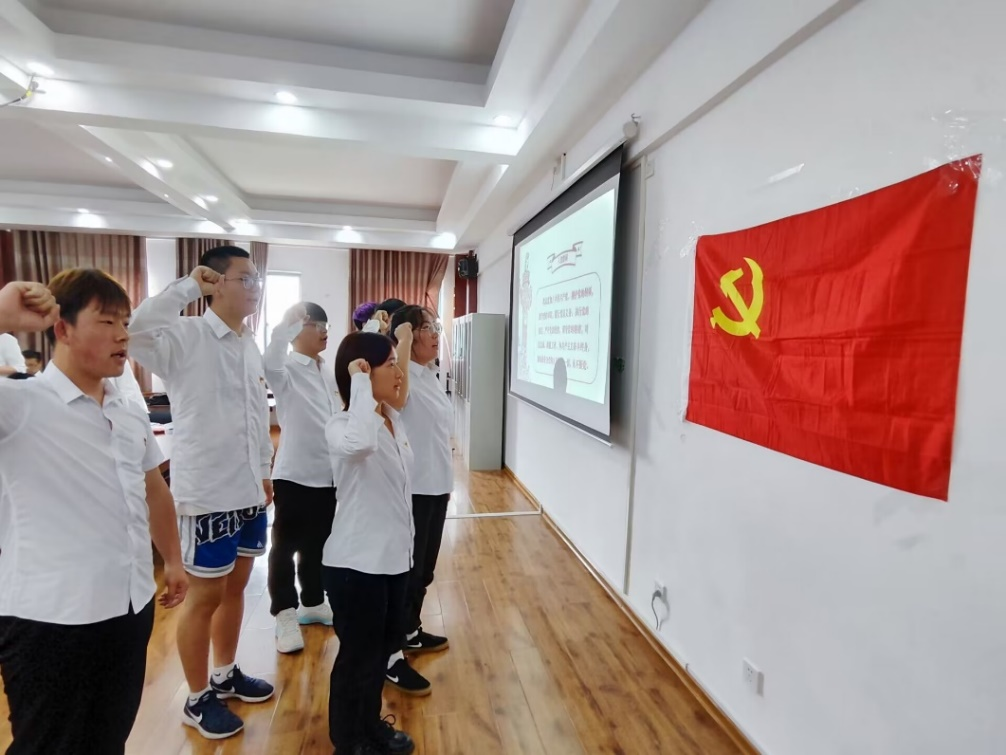 会议第五阶段,在党支部书记杨平平老师的带领下,本次接收的六名预备党员同志一起面向党旗进行庄严宣誓。在党旗面前,各位预备党员同志更加坚定了自己向党组织靠拢的决心,以及争取早日加入中国共产党的迫切希望。