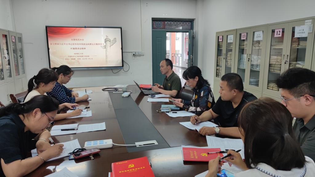 教工四支部于雁山校区12415召开党支部大会:学习贯彻习近平总书记在中共中央政治局第五次集体学习时重要讲话精神,本次学习会由支部书记梁延鹏主持,全体支部党员教师参与。在会议过程中,党支部同志对学习内容进行了讨论,并相互分享了学习心得。
