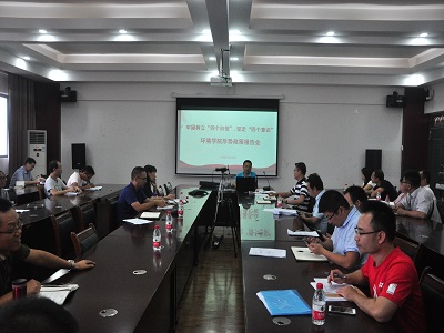 在雁山校区萃华楼12407会议室召开形势政策报告会,主题为“牢固树立‘四个自信’,坚定‘四个意识’”,学院党委委员、常务副院长游少鸿主讲。