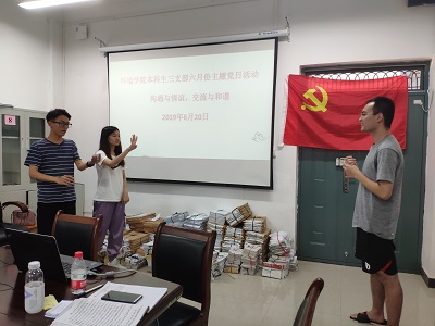 本科生三支部在雁山校区12415会议室举行了主题为“沟通与情谊,交流与和谐”的党日活动,此次党日活动由支部书记夏晴同志组织开展,本科生三支部全部在校20名党员同志参加。