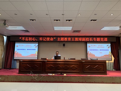 在专题党课上,王敦球副校长从“知史爱党、知史爱国”学习讲述了中国共产党为什么“能”、马克思主义为什么“行”、中国特色社会主义为什么“好”,的深刻内涵,指出要自觉把对党绝对忠诚体现在自己的岗位上、落实到行动中;从“学先进找差距、受警示存戒惧”的学习,警示与会人员要真正将“为人民服务”内化于心,外化于行动。要进一步加强系统理论学习,进一步发扬艰苦奋斗、埋头苦干、自觉奉献的优良作风,要进一步加强思想观念建设,提高辩证思维能力和认识问题、分析问题、处理问题的能力;同时, 王副校长从“不忘初心、牢记使命”专题调研结果对调研的基本情况、学校资源配置、统筹的主要成效以及存在的问题进行了简要介绍,并从高度重视资源配置和统筹工作、建章立制,推进资源配置及统筹的规范化、科学化管理、推进资源共享,以实现有限资源利用最大化、资源配置及统筹,要突出重点,做到优质优配、统筹兼顾,充分挖掘学校现有的资源、强化责任意识,体现考核结果的应用、强化主动服务意识,提升工作能力提出了具体举措。
