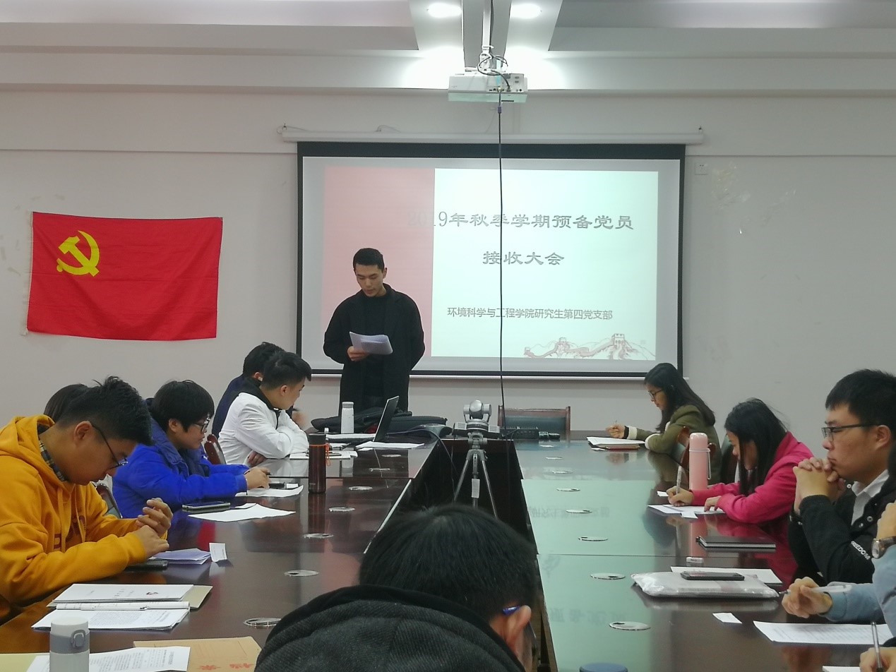 研究生四支部在雁山校区12407会议室召开预备党员接收大会。本次大会由支部黄健同志主持,对陈辉、李帅2名发展对象接收为预备党员进行讨论和表决。本次会议应到19人,实到17人,其中正式党员12名,因事请假2人。