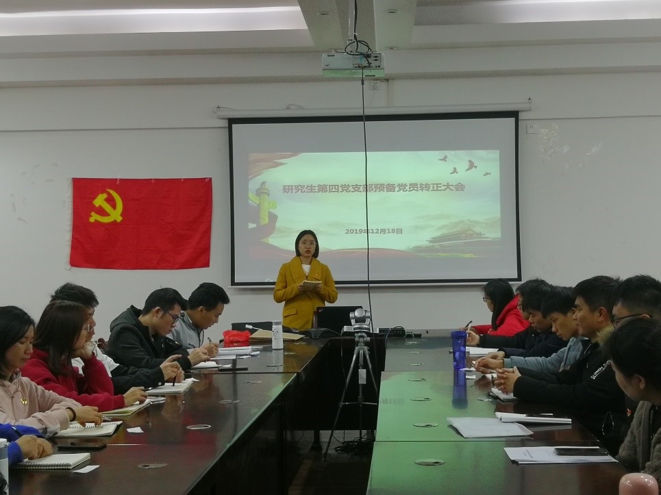 研究生四支部于雁山校区萃华楼12407室召开了预备党员转正大会,讨论简莉、李炜轩两名同志转正的问题。本次大会由支部副书记周正涛主持,其中应到会有表决权的正式党员13名,1名正式党员因事请假,实到会正式党员12名。