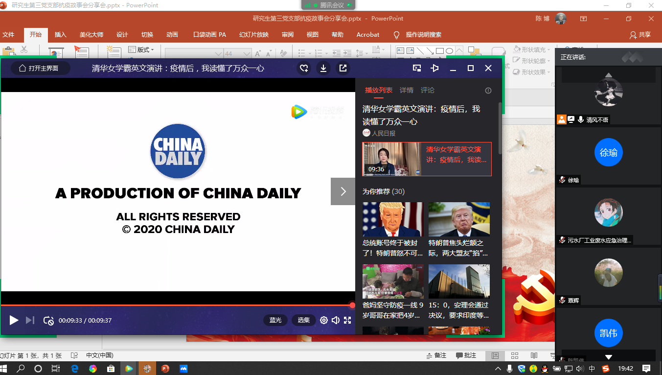 首先,宣传委员陈博向大家播放了一则清华大学女学霸演讲短视频《疫情后,我读懂了万众一心》,中国人民面对挑战,总能团结起来。中国人民齐心协力对抗新冠,全国各地的医护人员纷纷驰援武汉。各个城市也都支援物资、食品。最重要的是,几亿人待在家里,避免病毒扩散。祖国人民齐心协力,我们非常骄傲。面对疾病、死亡和未知,我们都会恐惧。看到他人受苦,我们也会心生同情。正是对他人的爱,让最胆小的人也能成为最勇敢的战士,承担最重大的责任,甚至舍己救人。