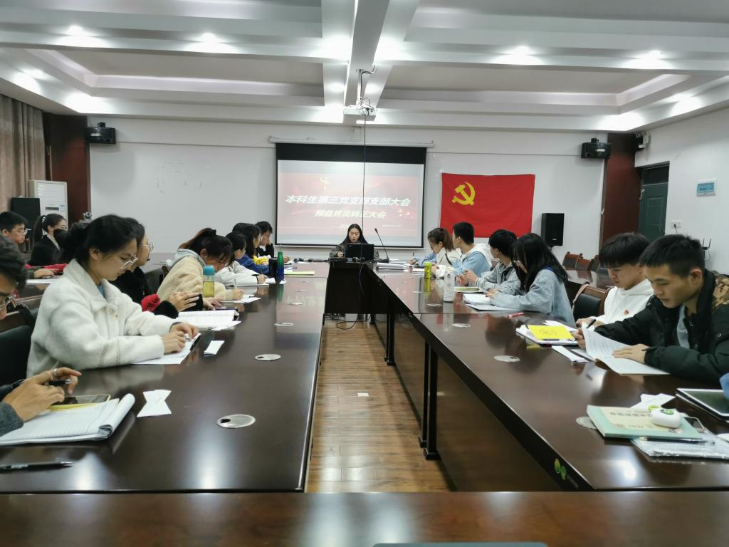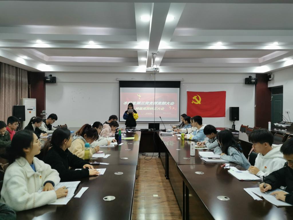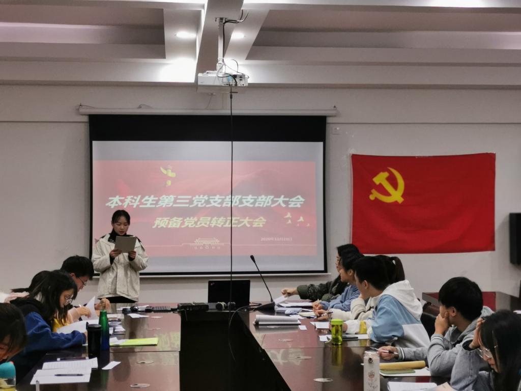 本科生第三党支部在雁山校区12407会议室组织召开预备党员转正大会,本次会议由党支部副书记张颖颖主持会议,全体党员同志参加会议。大会主要讨论杨诗琪、唐栎涵、代彬、连英涵、王紫维、黄慧敏和龙飘七名同志转正的问题。