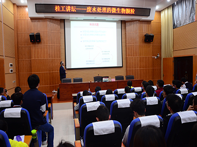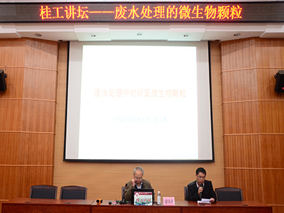 正值桂林理工大学60周年华诞,在主持人对俞汉青教授进行介绍之后,俞教授为我桂工送上了最诚挚的祝福。此次的学术报告会,他详细介绍了废水微生物处理系统的固液分离和好氧颗粒微生物的优点及应用,尤其在好氧微生物方面进行深入研讨。会上,俞教授还通过现场互动形式提出一些科学问题来充实报告。比如好氧颗粒微生物是如何形成的?它有哪些基本的特征?如何保证其降解污染物的能力?特别是好氧颗粒微生物的形成过程,俞教授不仅介绍了好氧颗粒微生物的形成机制,还说明了好氧颗粒微生物的四个阶段。在介绍微生物特性表征的时候,也说明了微生物的不足之处,即存活时间不长。